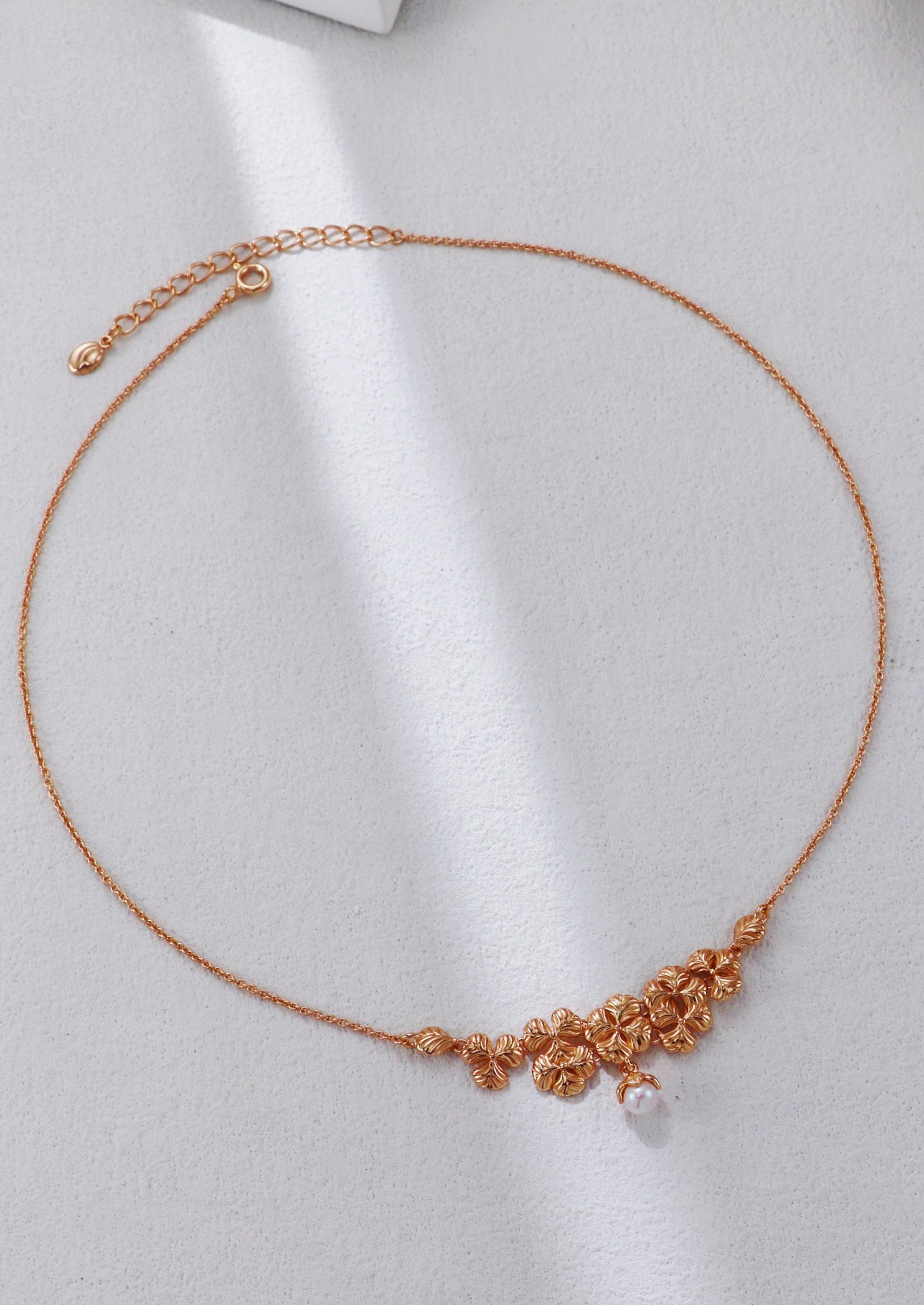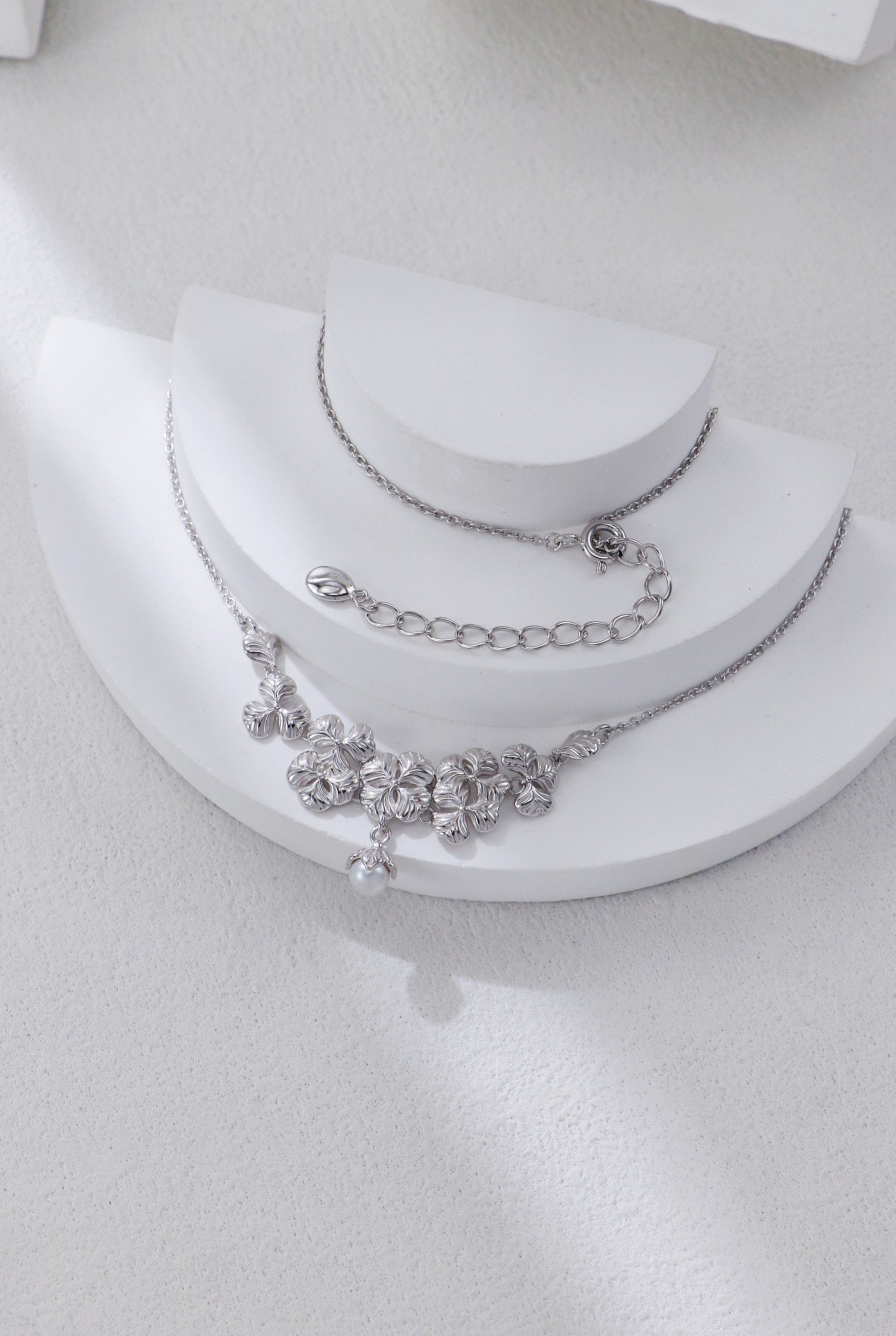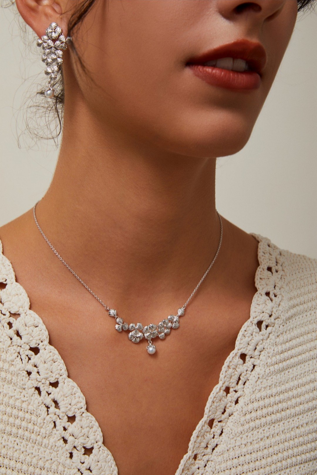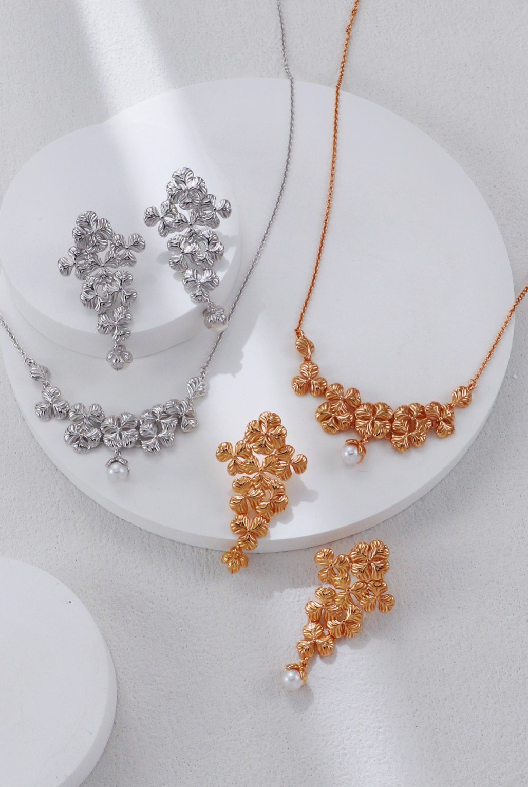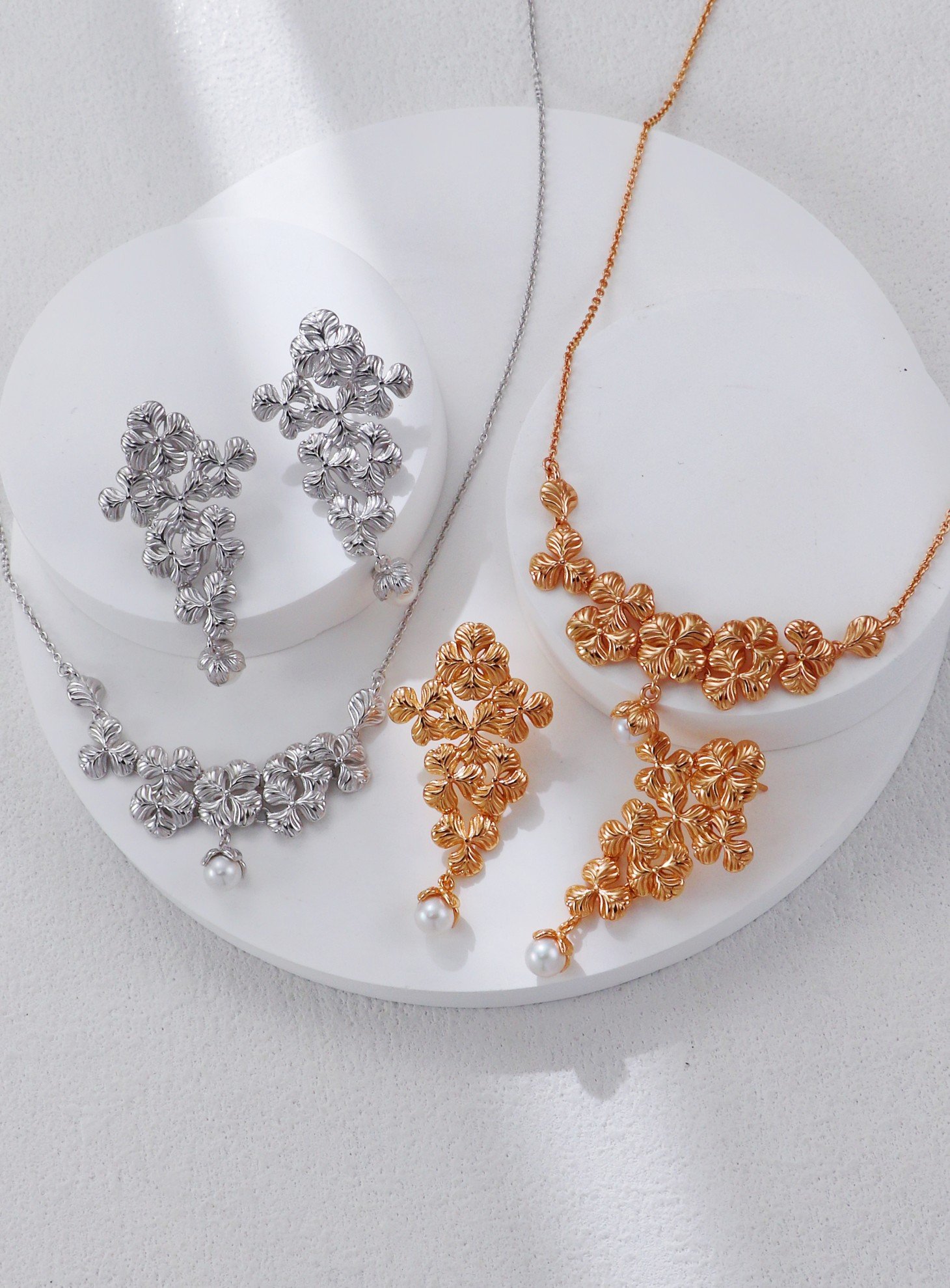 At the heart of both the necklace and earrings hangs a delicate pearl drop, adding a soft glow and classic femininity to the sculptural floral motif. The set is available in both rhodium-plated silver and 18K gold-plated finishes, allowing you to choose between radiant cool or warm tones.
