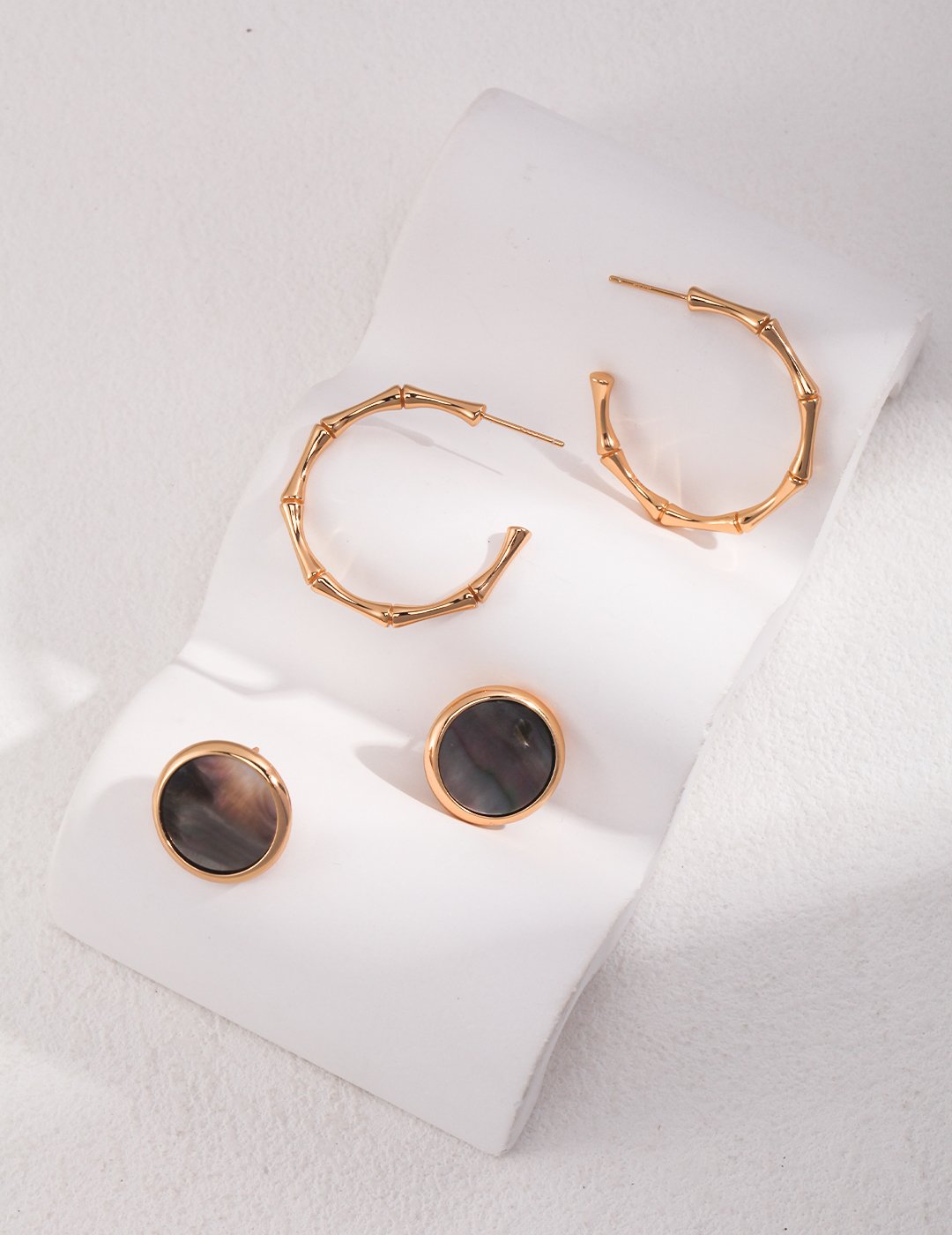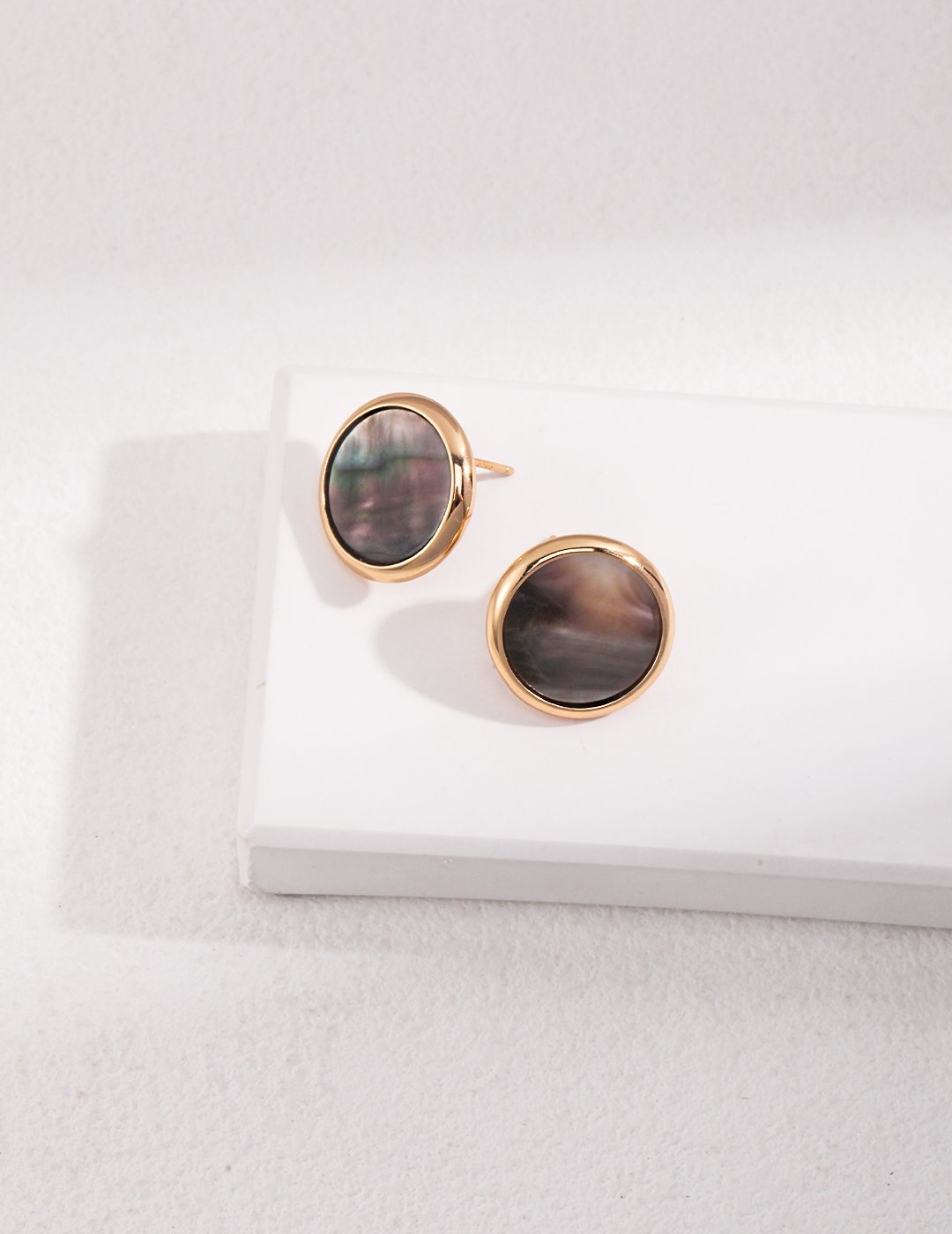 Each 18mm diameter earring highlights the black shell’s natural gradient colors, from deep charcoal to soft taupe, with mesmerizing organic patterns. The simple sterling silver setting accentuates the shell’s inherent beauty while maintaining a clean, modern silhouette.